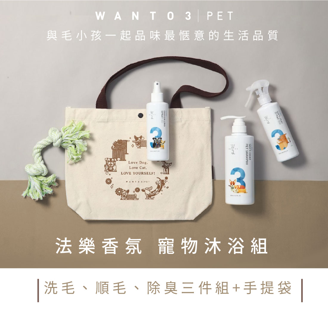 - 寵物沐浴組內容:洗毛沐浴精任選1罐、空間除臭噴霧任選1罐、順毛除臭噴霧任選1罐、贈送遛狗提袋1個。